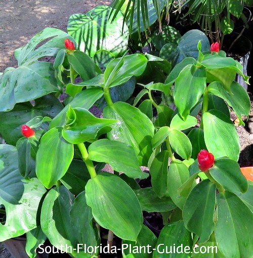 Red Button Ginger - sometimes just called Red Ginger - grows anywhere in South Florida in partial to full shade. It can grow about 4 to 5 feet tall, so place it in back of smaller things like ferns or bromeliads.