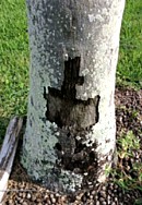 "There is a very large queen palm in my back yard. I noticed the 'bark' falling off about 2 years ago. I thought it was when the lawn guy got too close. It is about 2' above the ground and it is getting bigger. The fronds are green and the palm looks good otherwise. What's going on - and what should I do? "