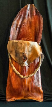 The process takes about two weeks and steps include gathering (I use mostly Foxtail and Areca palms), soaking in a solution for about three days, hand-shaping/molding, sewing, embellishing (with natural materials such as seeds, nuts, carved bone, shell and horn), drying, and applying a hand rubbed finish. A card includes the details of all the materials used in each piece.